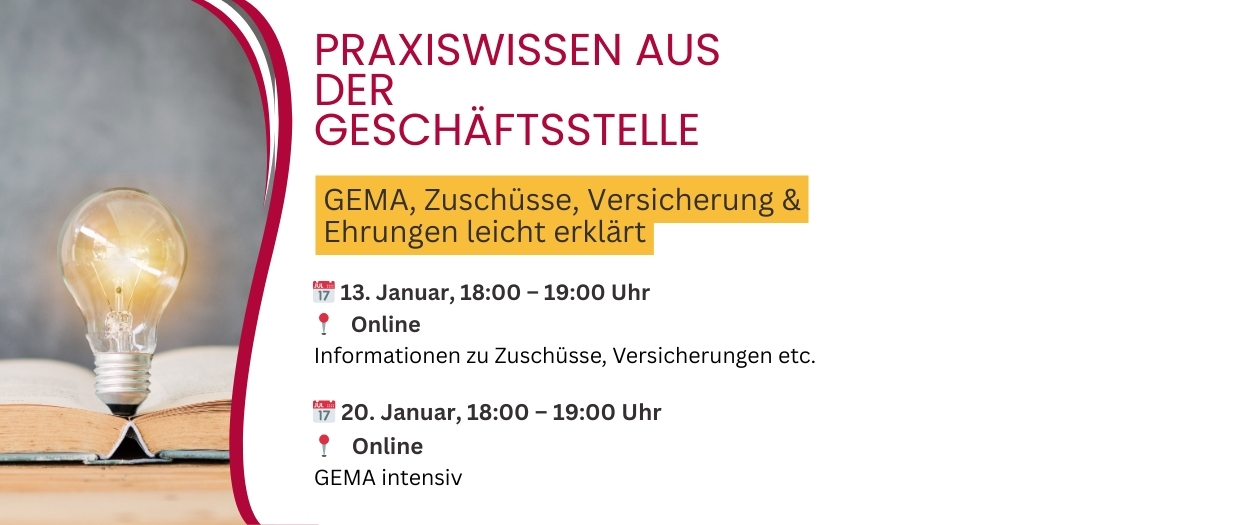 Die kostenlosen Online-Seminare vermitteln praxisnahe Informationen zu zentralen Vereinsthemen, u. a. Zuschüsse, Versicherungen, Bestandserhebung und Ehrungen. Zusätzlich gibt es einen Intensiv-Workshop zur GEMA.